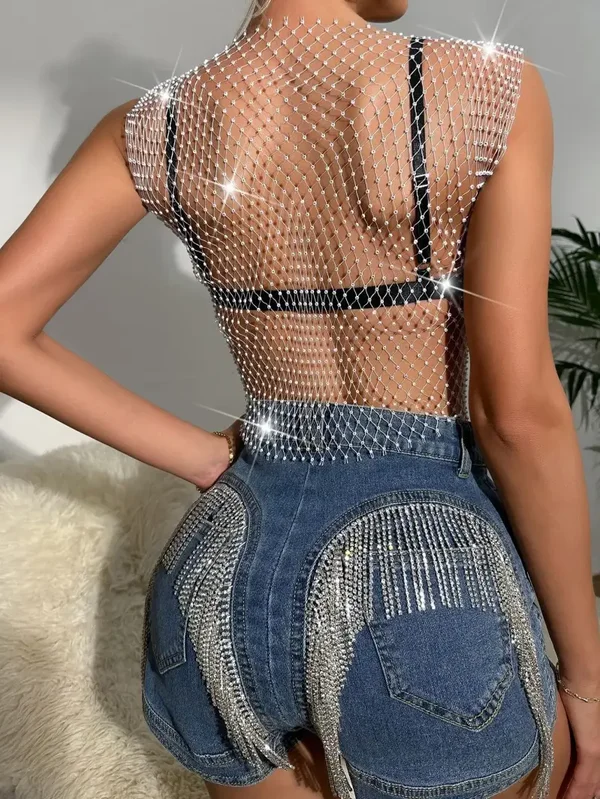 Sta in het middelpunt van de aandacht met onze Strass Crop Top, een absolute must-have voor je zomerse avonturen, of het nu op het strand is of tijdens een wilde nacht in de club. Met zijn betoverende strass-details, mesh-afwerking en hoge elasticiteit biedt deze top de perfecte mix van stijl, comfort en glamour.