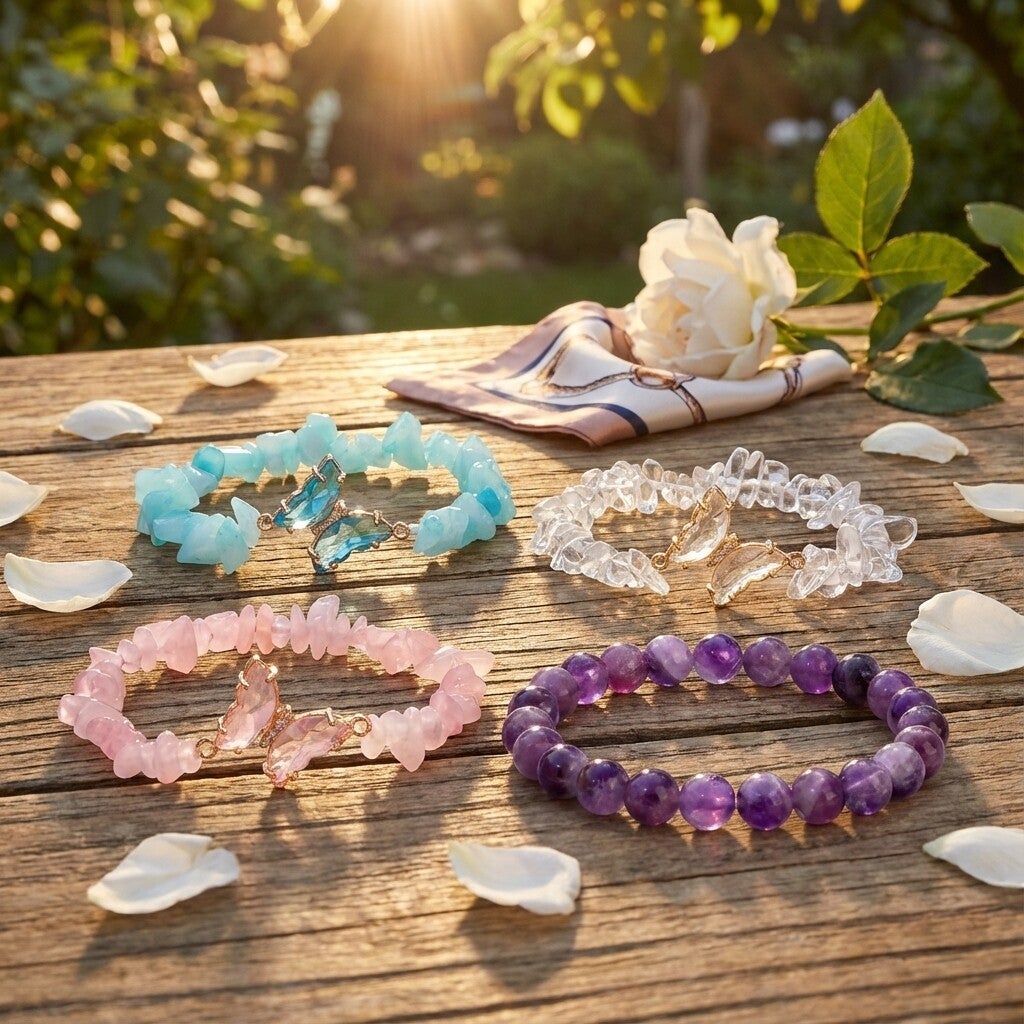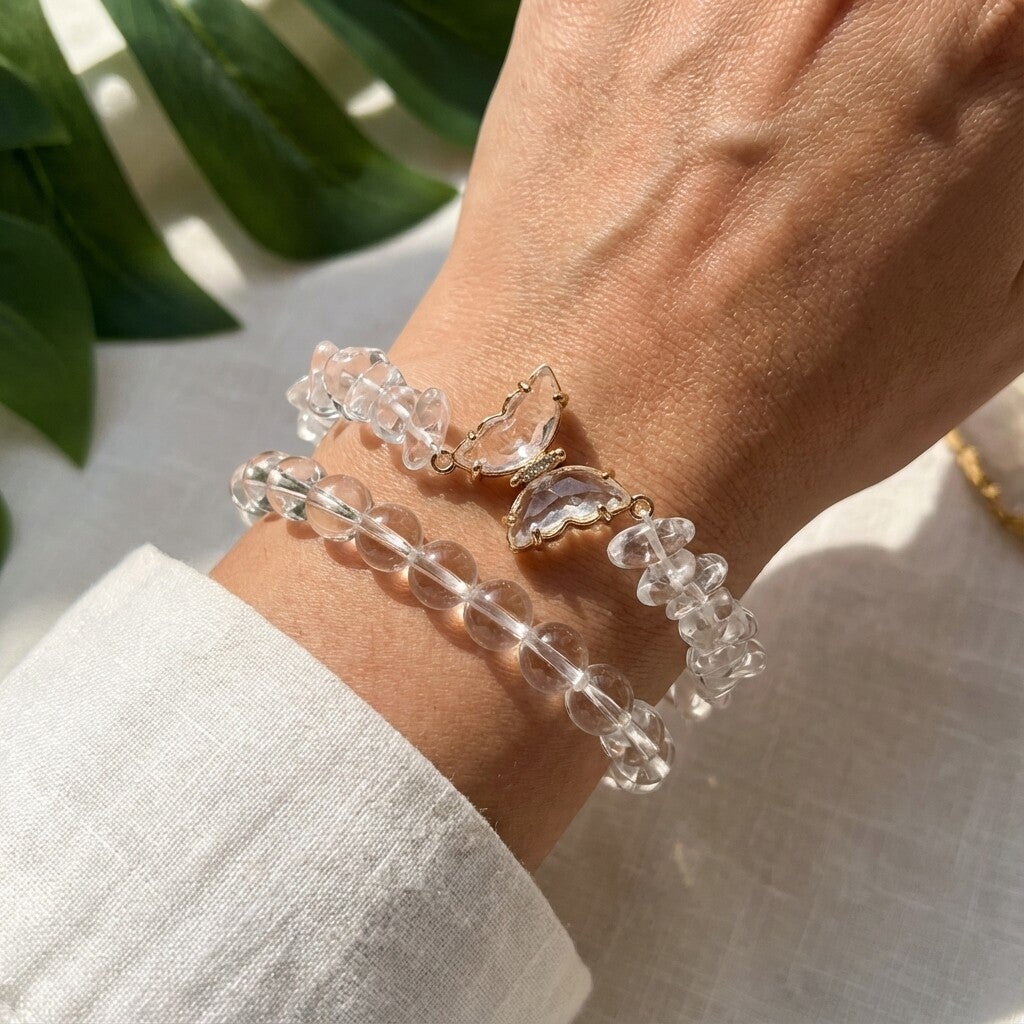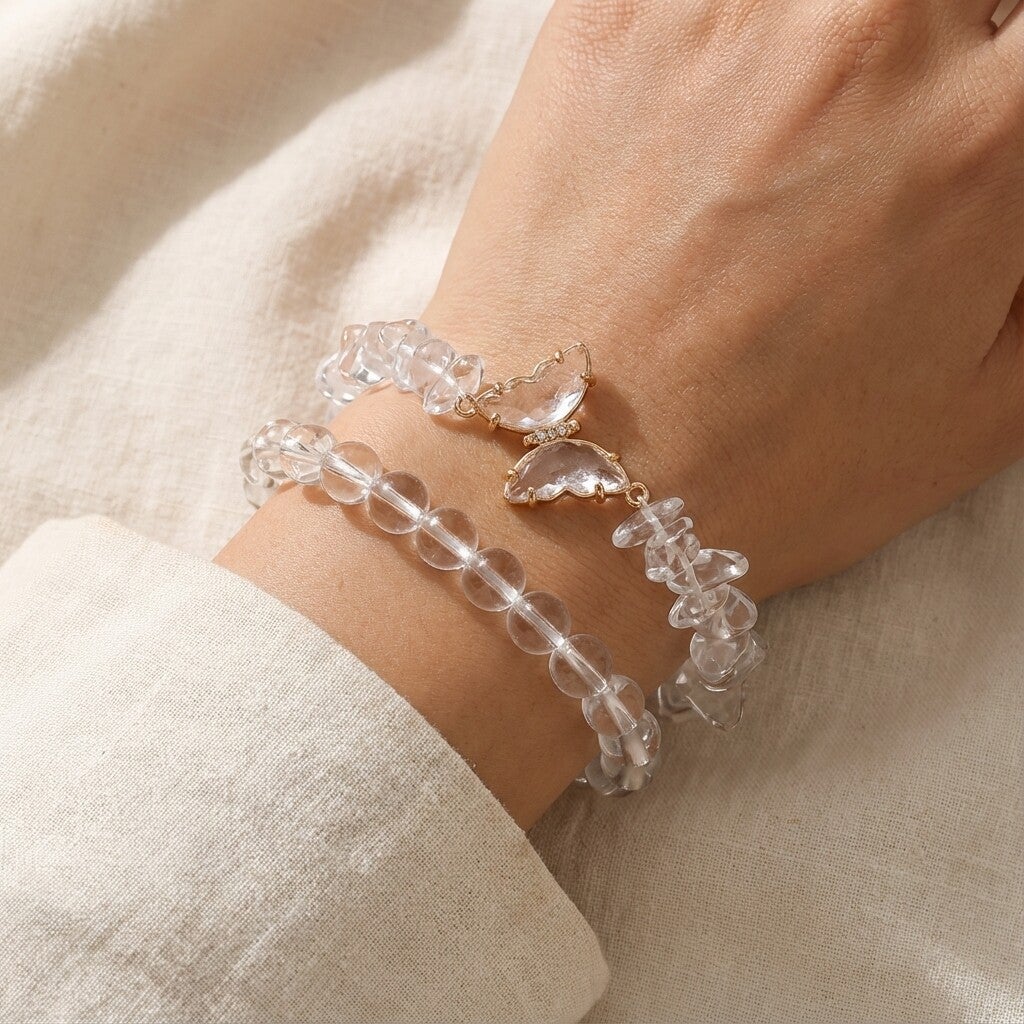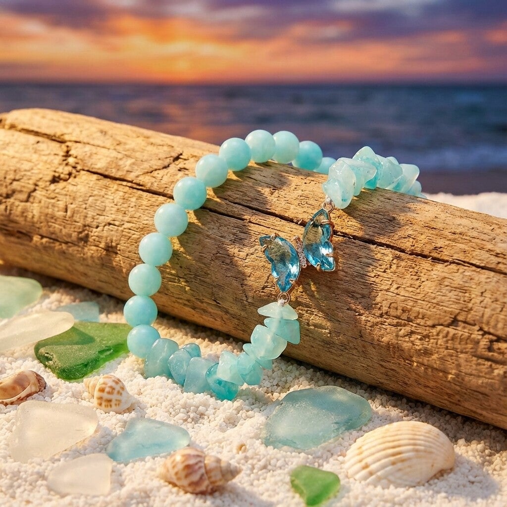 De eerste armband in de set is een prachtige creatie met ruwe amethist stenen, die de authentieke charme en natuurlijke kracht van de amethist laten zien. Elk ruwe kristal is met zorg geselecteerd en biedt een rauwe, organische schoonheid die perfect wordt aangevuld door een delicate vlinderpendel van amethist. De vlinderpendel, handgemaakt van zuivere amethist, symboliseert transformatie en vrijheid, en voegt een extra vleugje magie en betekenis toe aan deze armband 🦋💜