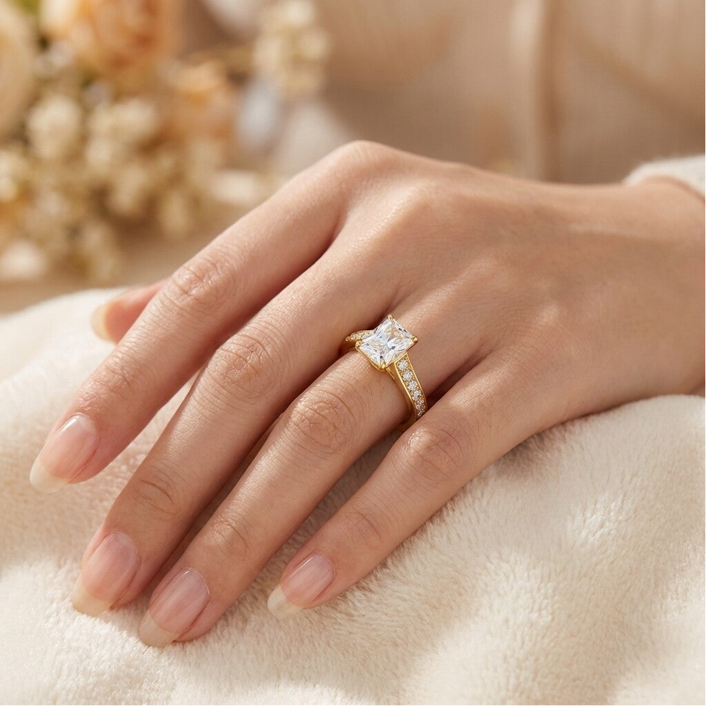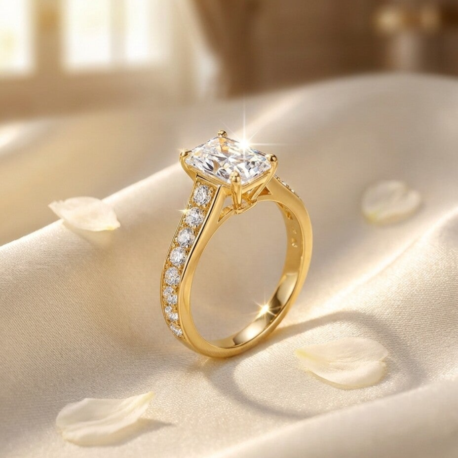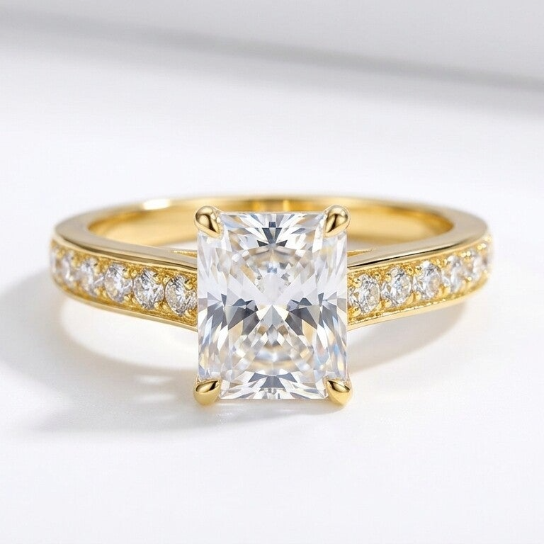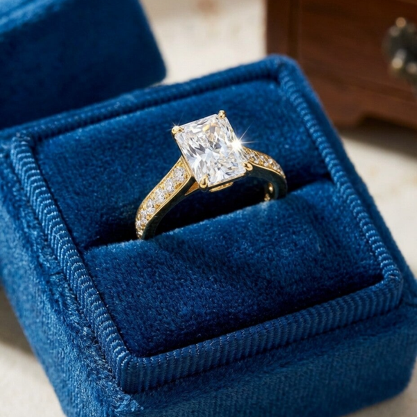 In het centrum schittert een royale 2ct Lab-Grown Moissanite diamant, bekend om zijn glasheldere diepte en verfijnde schittering. De smaragdslijping straalt luxe uit dankzij de strakke lijnen en spiegelende facetten, waardoor de steen elke lichtstraal sierlijk vangt.