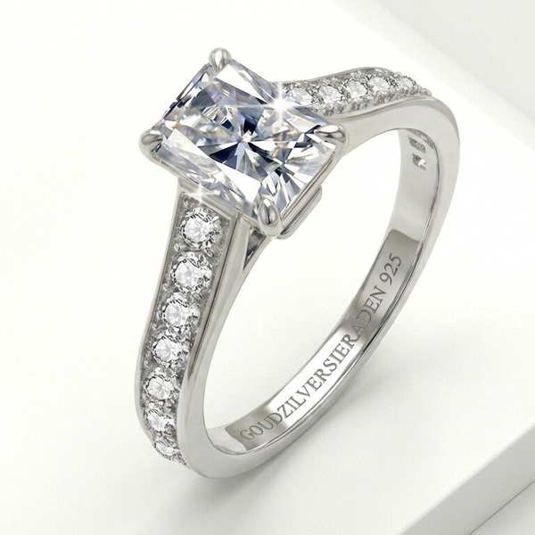 Aan beide zijkanten van de hoofdsteen bevinden zich 7 sprankelende zirkonia steentjes per zijde. Deze subtiele fonkeling versterkt de elegante uitstraling van de ring en laat de centrale Moissanite diamant nóg meer schitteren.