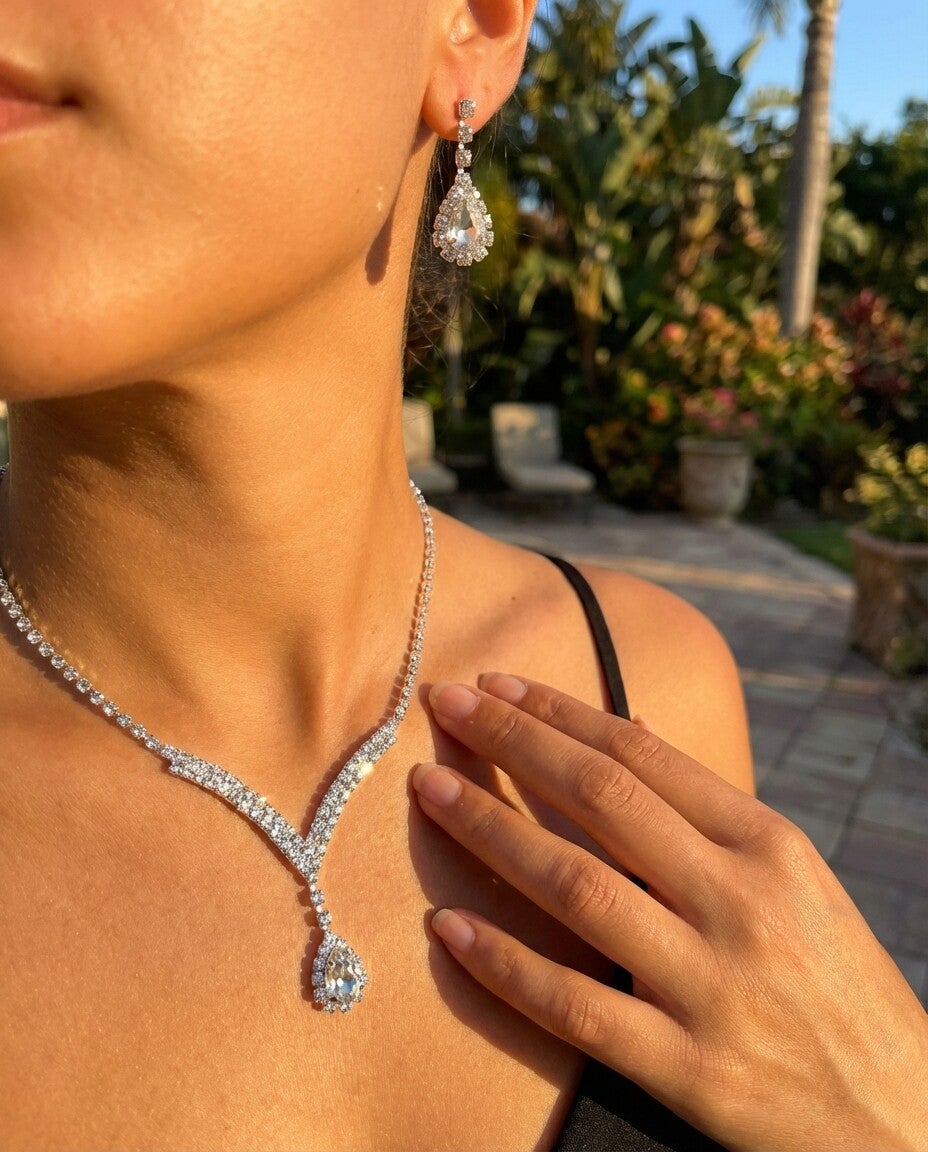 👑 Hoogtepunten van de Set: 🌼 Elegante Ketting: Onze ketting straalt klasse uit met een prachtig arrangement van gesimuleerde diamanten en briolette edelstenen die subtiel oplichten bij elke beweging die je maakt. Een vleugje sprankeling die je halslijn zal accentueren en bewonderende blikken zal vangen.