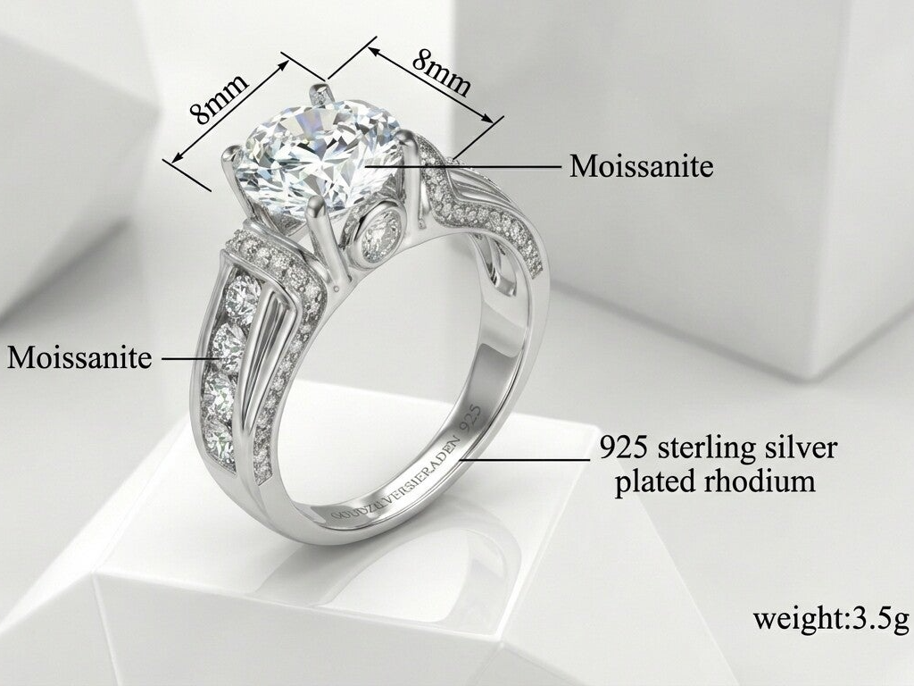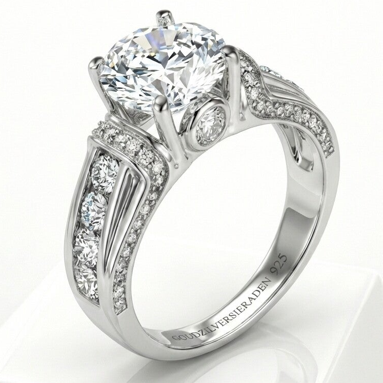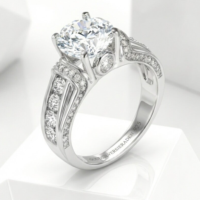 Aan beide zijkanten van de centrale steen schitteren vier extra Moissanite diamanten, die de ring een extra vleugje luxe en glans geven. Deze zorgvuldig geplaatste zijstenen versterken de uitstraling van de hoofdsteen en creëren een harmonieus, stralend geheel.